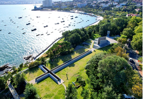 一战华工纪念馆位于海源公园东侧,是国内首个一战华工专题纪念馆。建筑以混凝土与木纹石壁打造极简风格,大部分空间设于地下,空中俯瞰呈“十”字造型,与海岸风貌浑然一体。